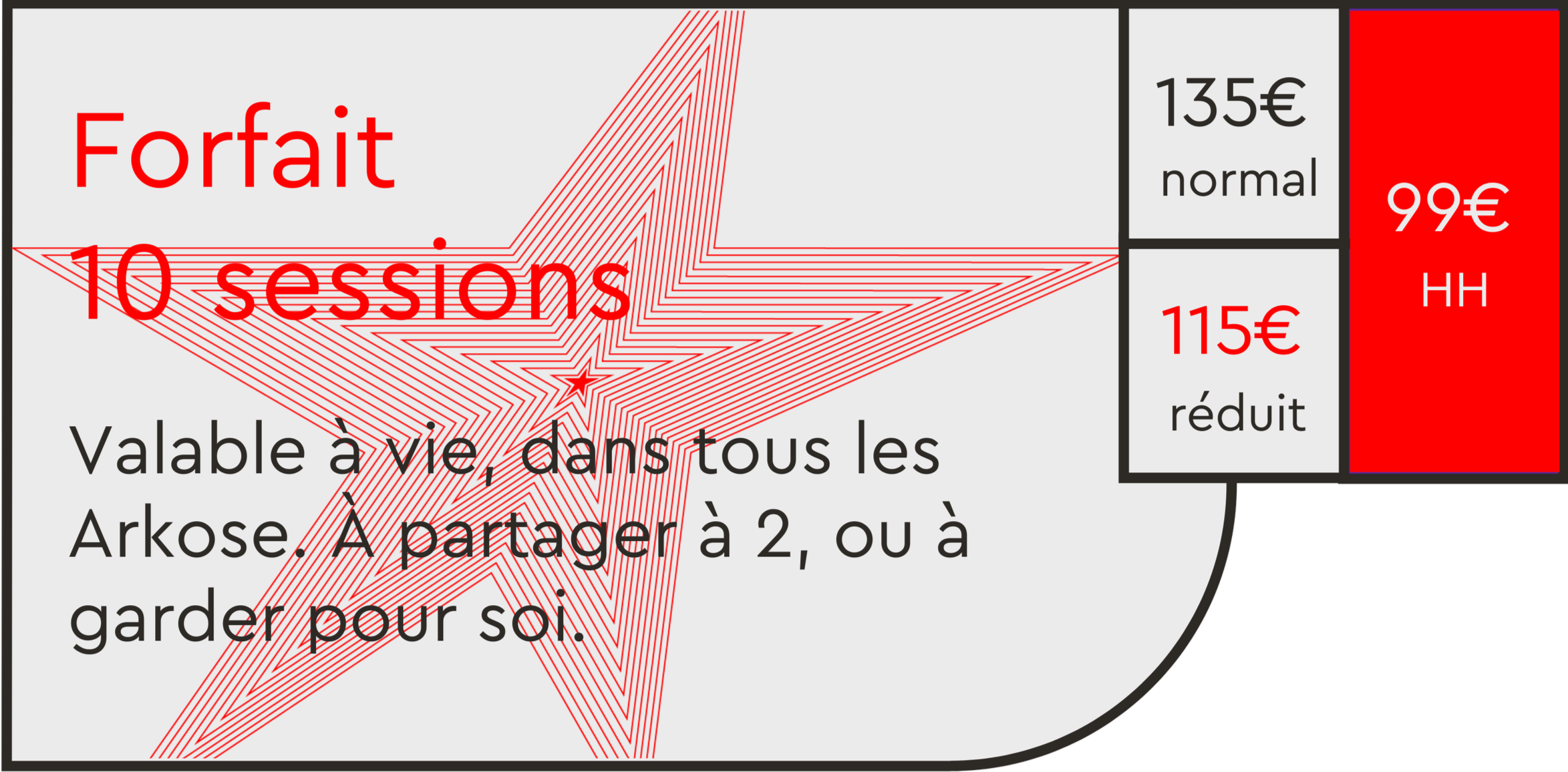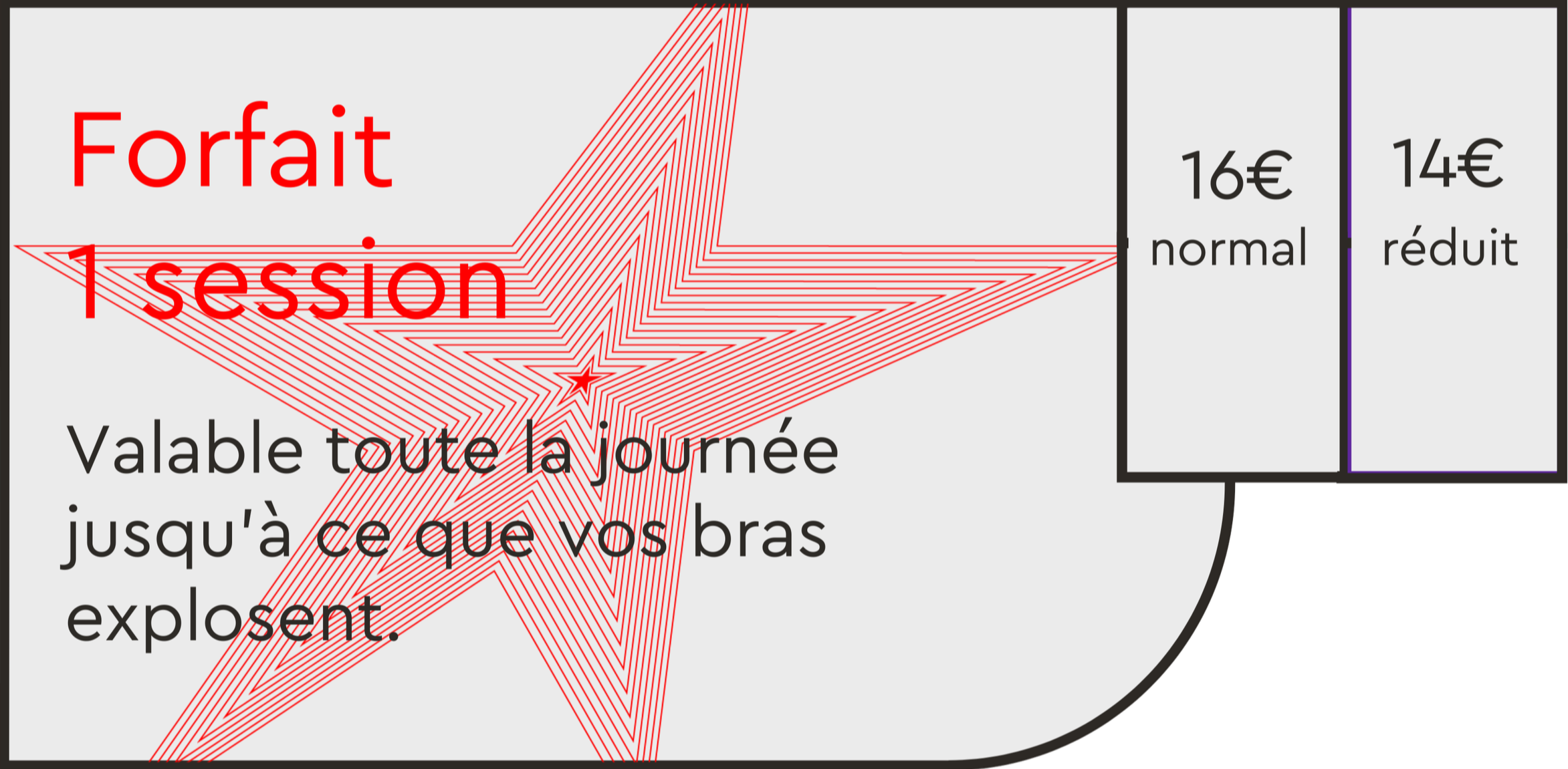 Tarif Réduit* : 12-25 ans, pompiers, militaires, sous réserve de la présentation d'un justificatif en cours de validité.